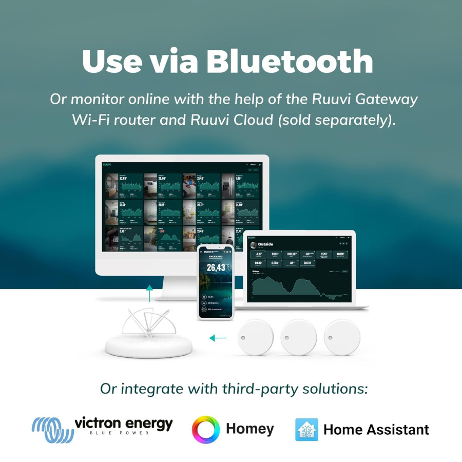 Vzdálené monitorování: Pokud se nenacházíte v dosahu Bluetooth, je k dispozici online vzdálené monitorování s Ruuvi Gateway a Ruuvi Cloud, oba se prodávají samostatně.